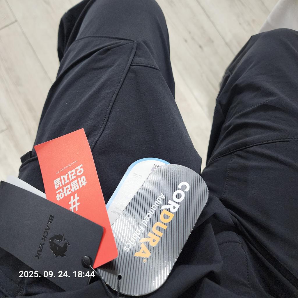 소재 | 겉감 : 나일론 91%, 겉감 : 폴리우레탄 9%, 주머니감 : 폴리에스터 100% |