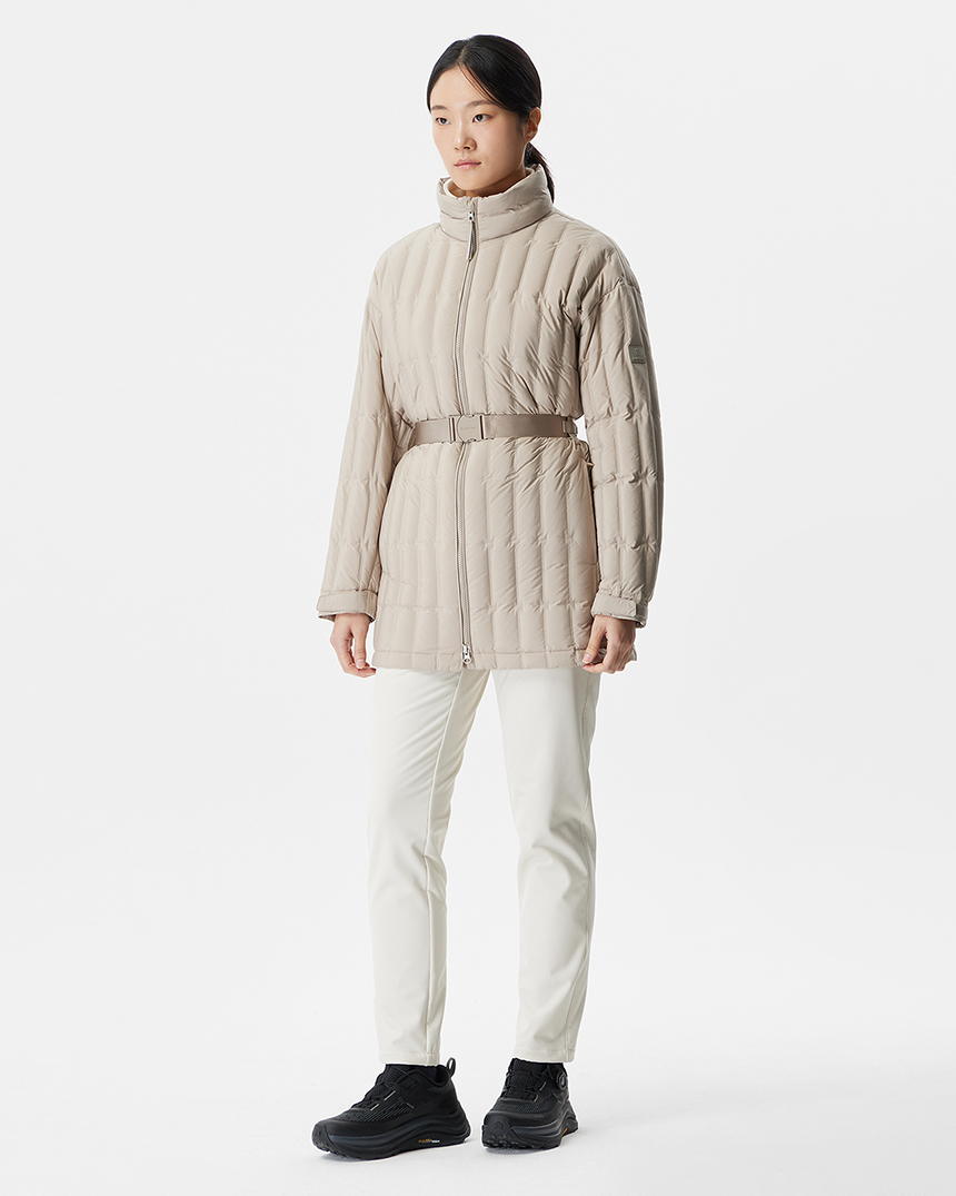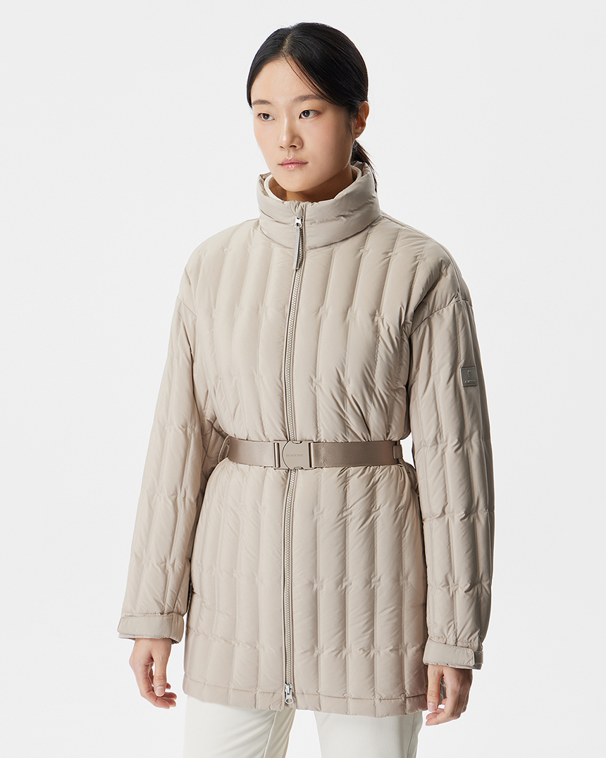 [세로형 튜브 패턴 소재를 적용한 여성 루클라 벨트 튜브 다운자켓]