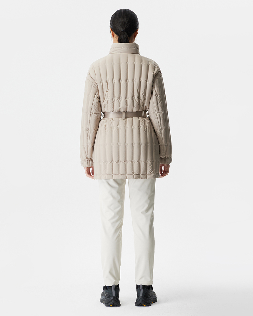 퀼팅 봉제선이 없는 튜브 패턴을 사용하여 봉제선에서 다운이 새어나오는 삼출 현상을 방지하여 보온성을 강화한 벨트 미드기장 경량 다운입니다.