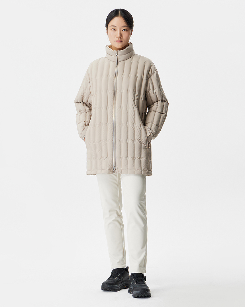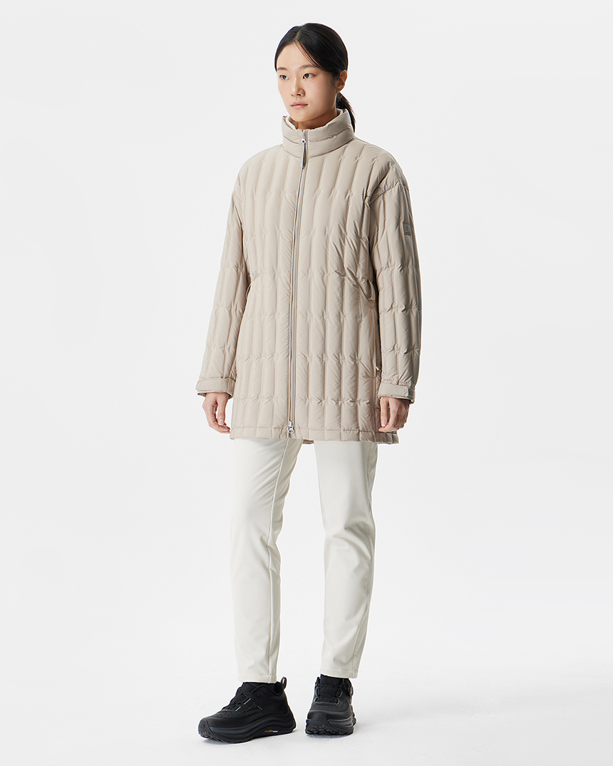 세로형 튜브 패턴과 허리 벨트 디자인으로 보다 슬림한 실루엣을 연출하며, 미드기장으로 더욱 따뜻하게 착용 가능합니다.