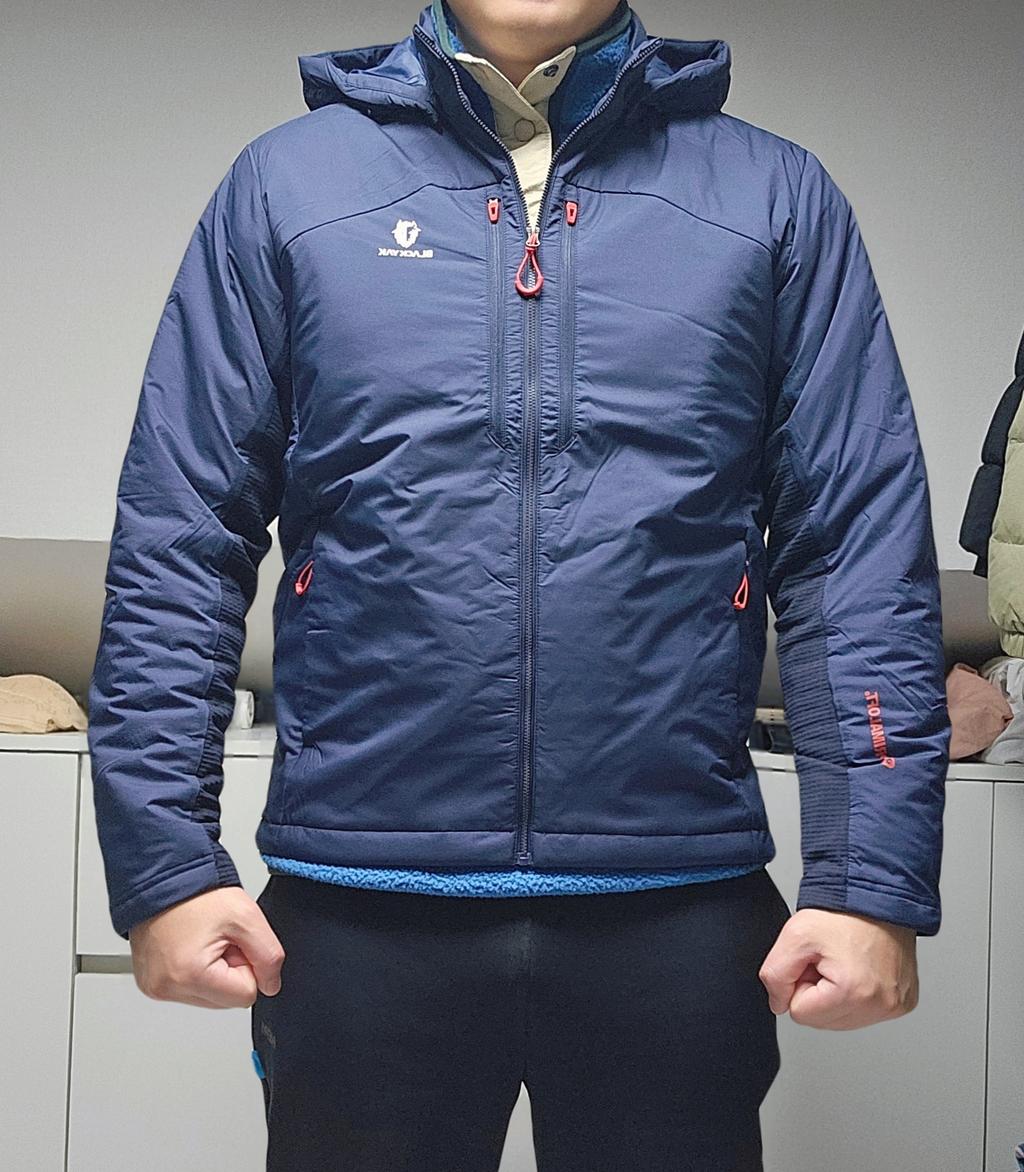보온성과 활동성에 중점을 둔 상품으로 앞판 몸쪽과 소매 상단 부분 얇은 두께감의 프리마로프트 패딩 충전재를 적용하여 보온성을 전달하는 스타일입니다.