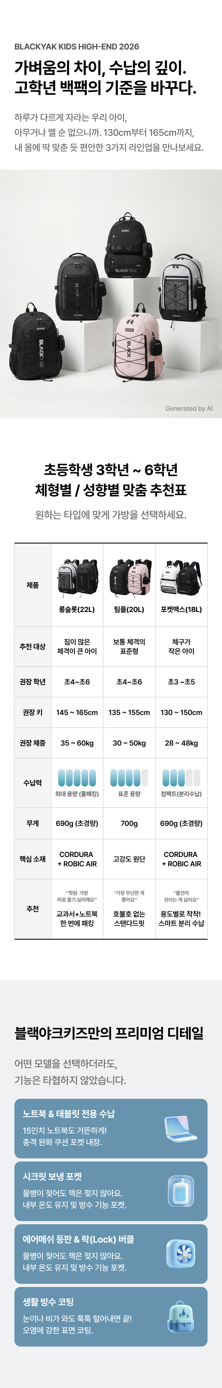 º 5포켓 구성의 다용도 분리 수납 구조로 교과서·필기구·보조가방 등 다양한 소지품을 체계적으로 정리