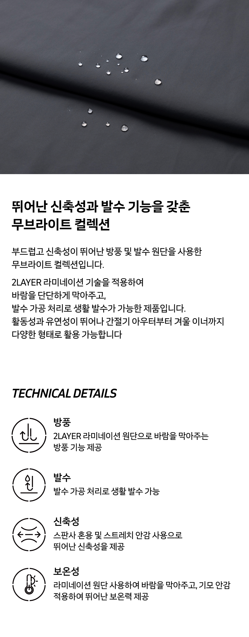 기능 : 신축성, 보온성, 발수가공, 방풍(라미네이션)