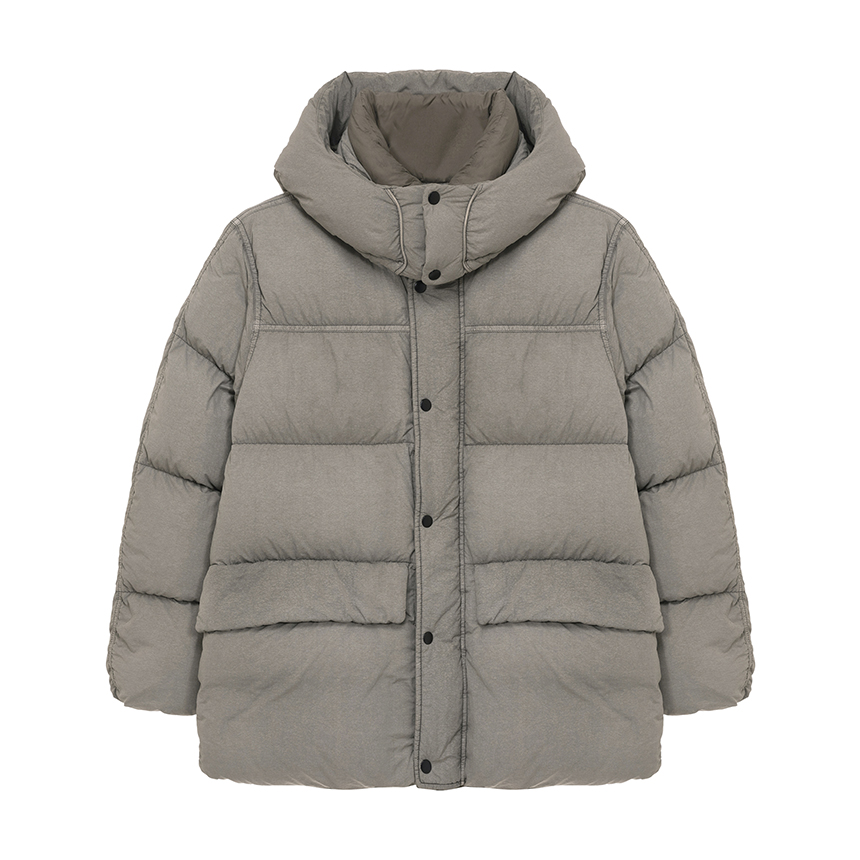 피그먼트 다잉 염색기법과 바이오 소프트 워싱을 적용한 후드 다운입니다.