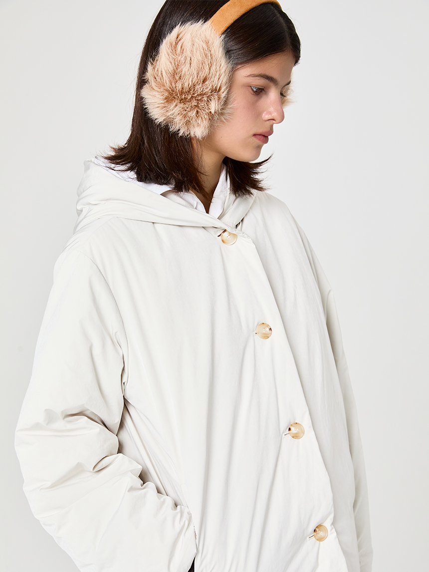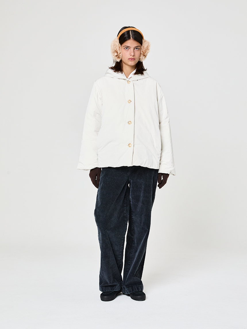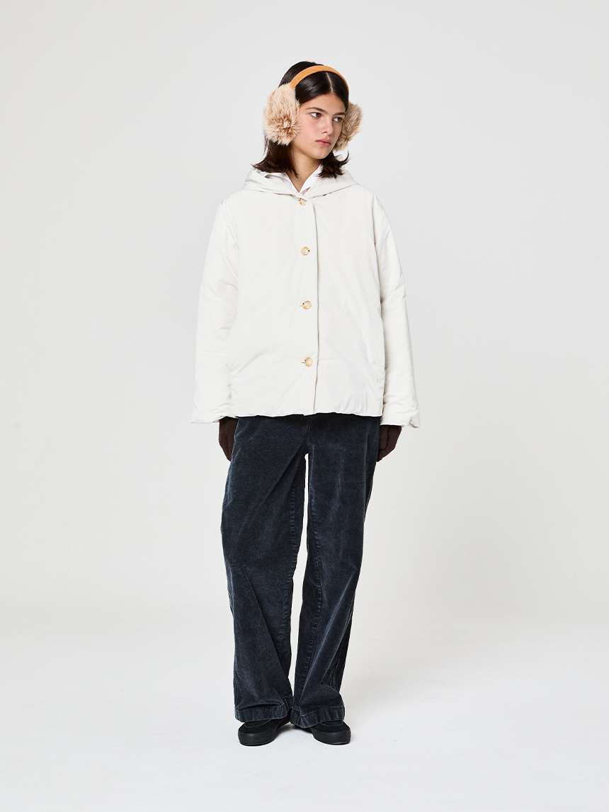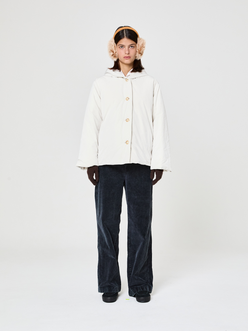 패딩(Kr-pet 100%)을 안쪽으로 퀼팅 하여 안정감을 높이며 외관을 단정하게 표현했고, 숄 후드 디자인과 벨 슬리브 포인트로 매력적이고 포근한 실루엣을 자아냅니다.