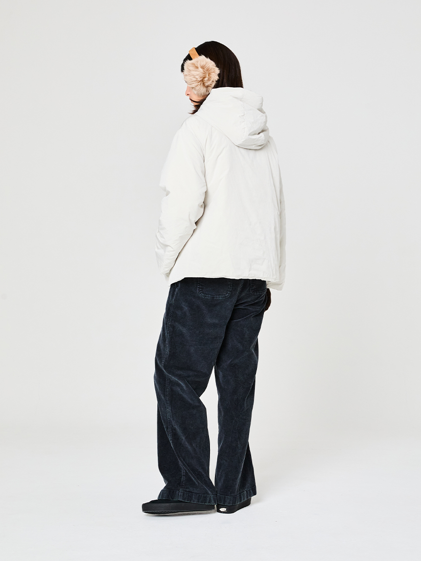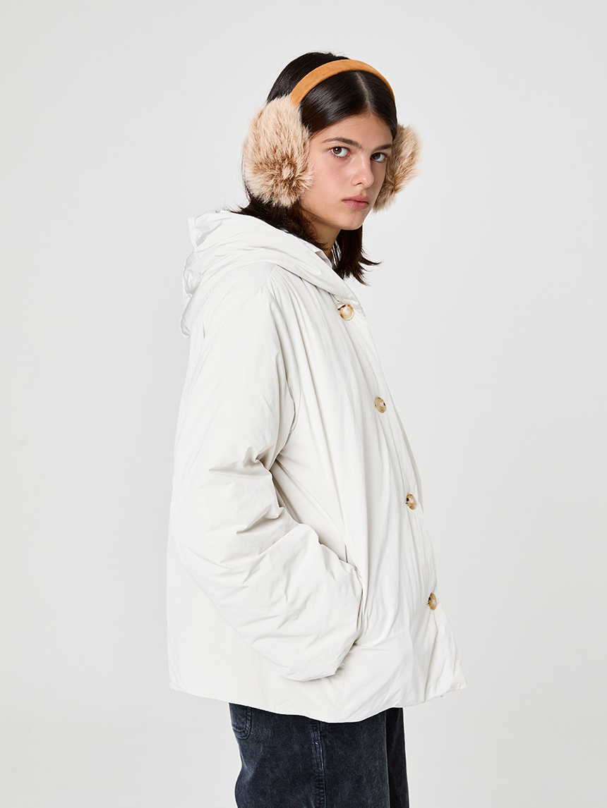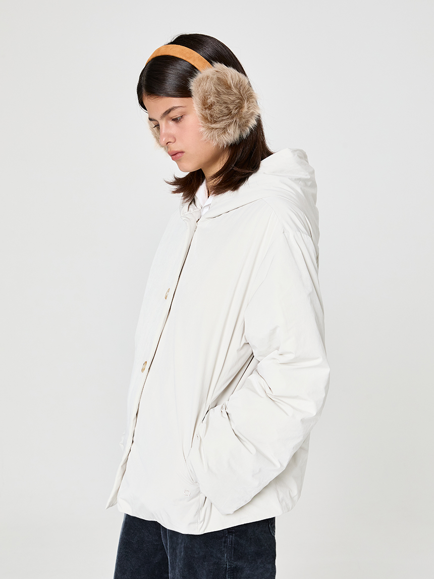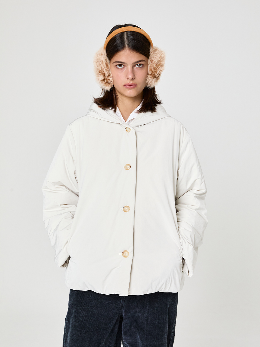 패딩(Kr-pet 100%)을 안쪽으로 퀼팅 하여 안정감을 높이며 외관을 단정하게 표현했고, 숄 후드 디자인과 벨 슬리브 포인트로 매력적이고 포근한 실루엣을 자아냅니다.