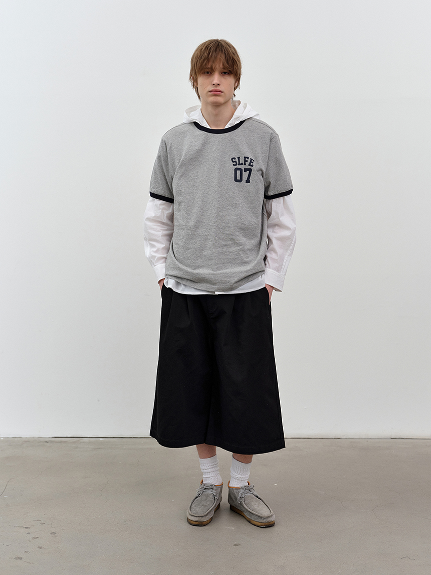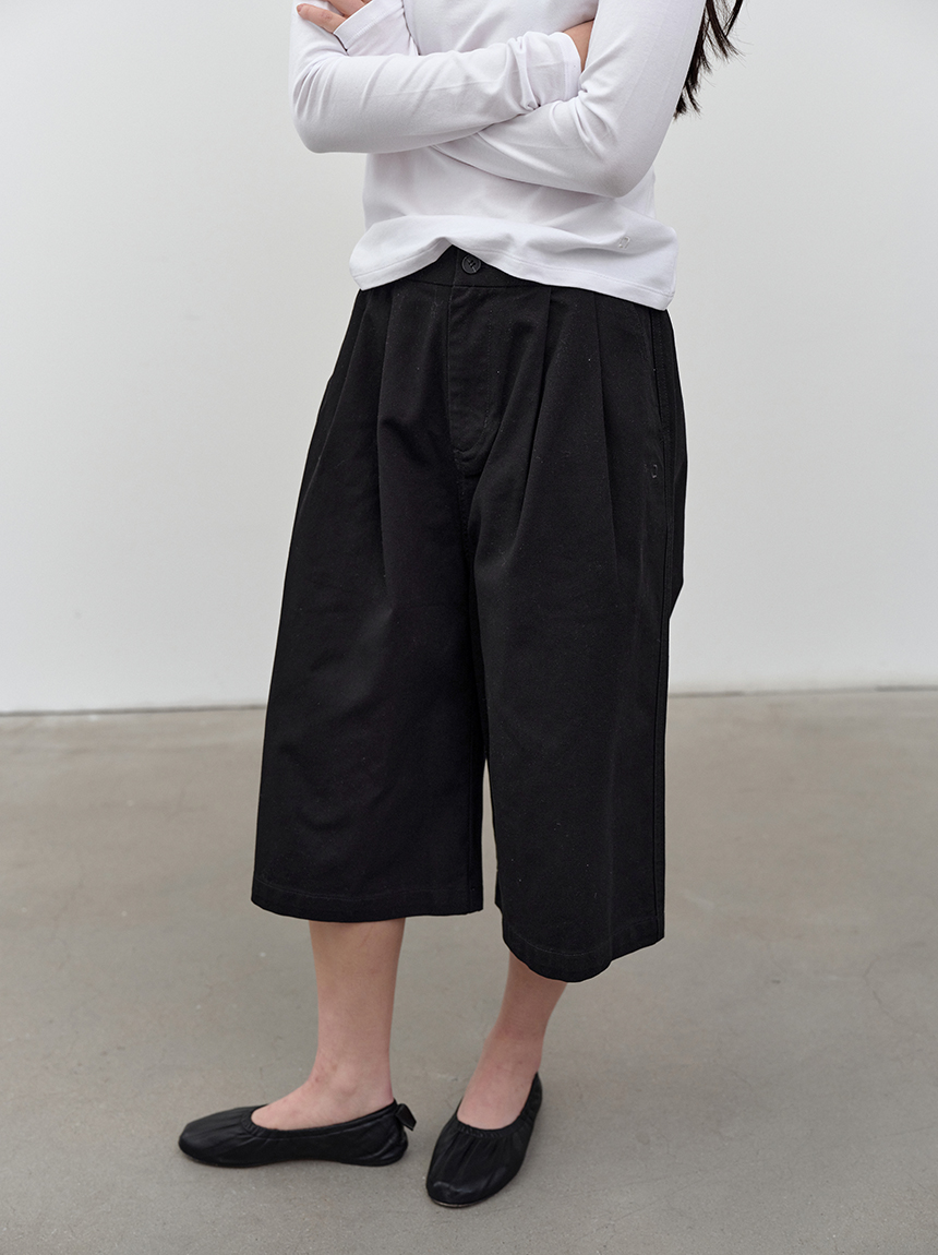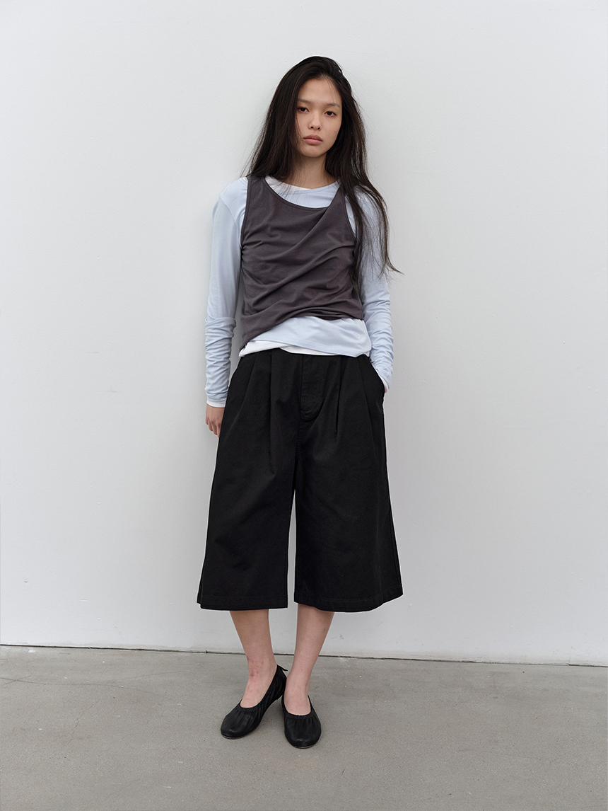 무릎 아래로 떨어지는 버뮤다 기장과 전면 핀턱 디테일이 더해져 균형 잡힌 실루엣을 완성합니다.