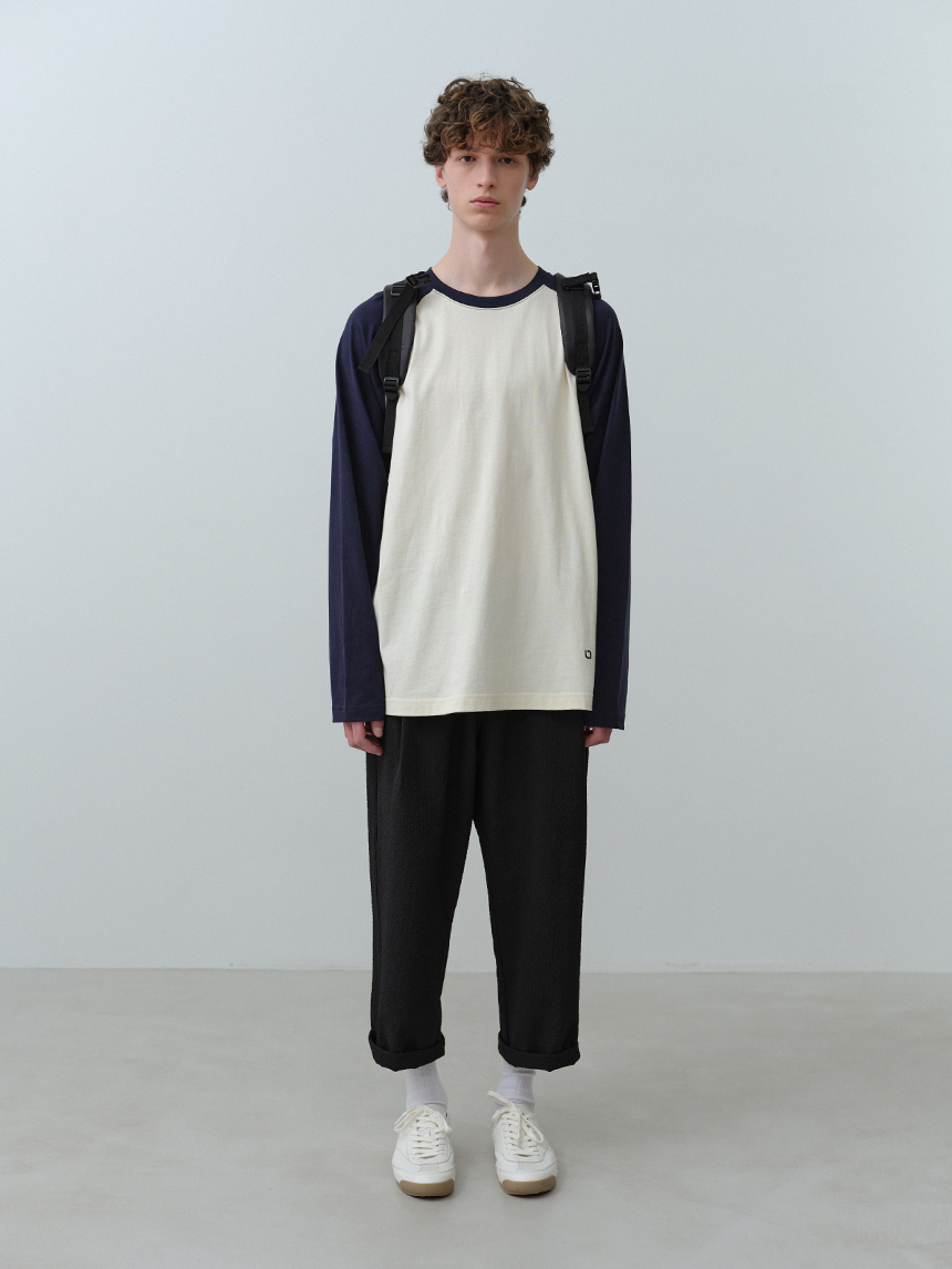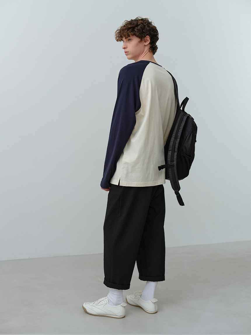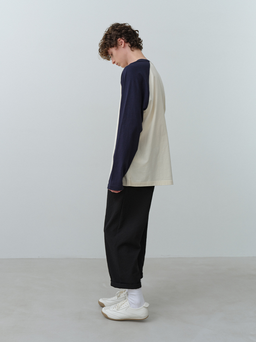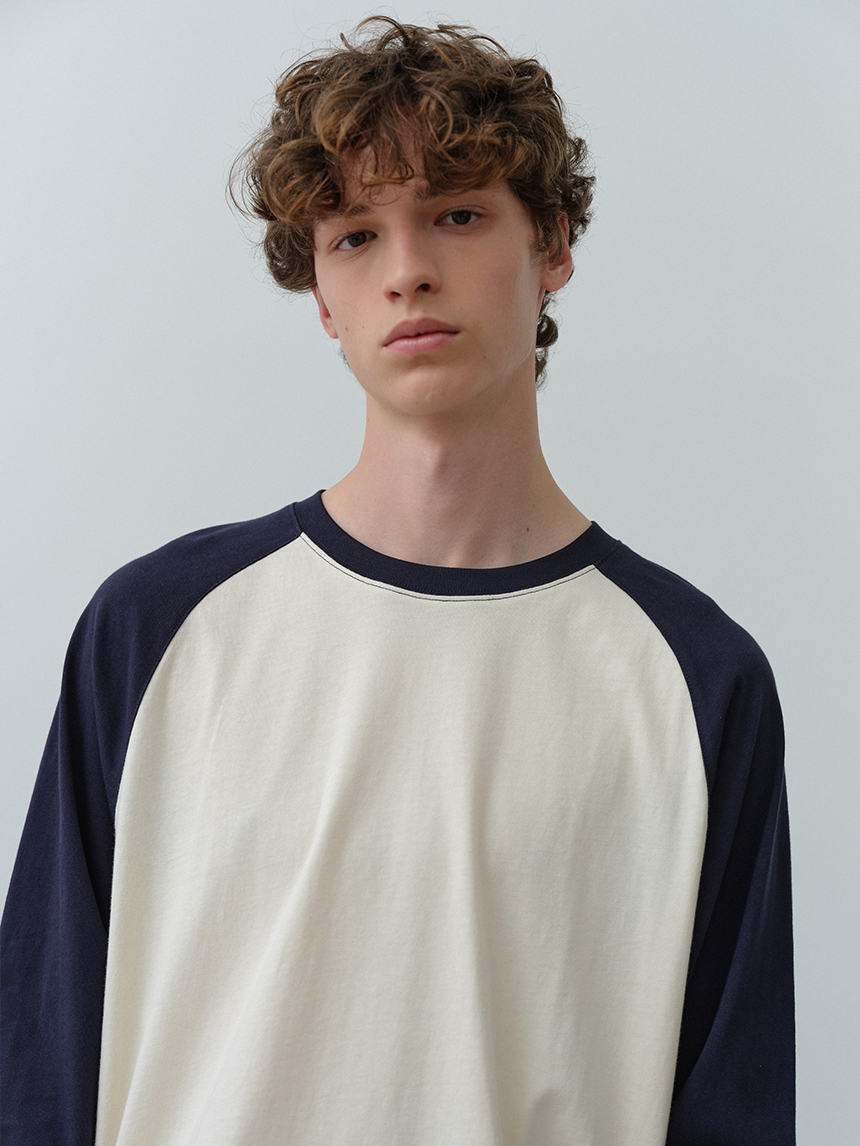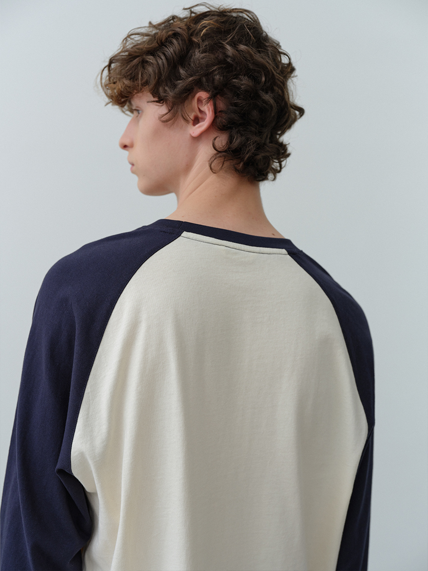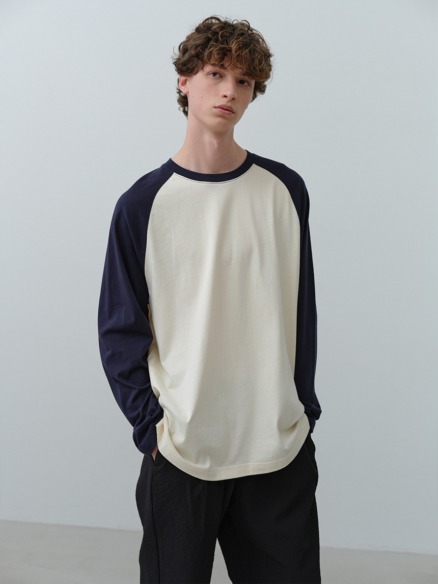 어깨선을 따라 자연스럽게 떨어지는 라글란 구조에 바디와 소매 배색 디테일을 더해 캐주얼한 포인트와 완성도를 높였습니다.
