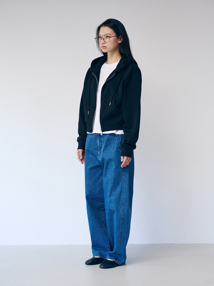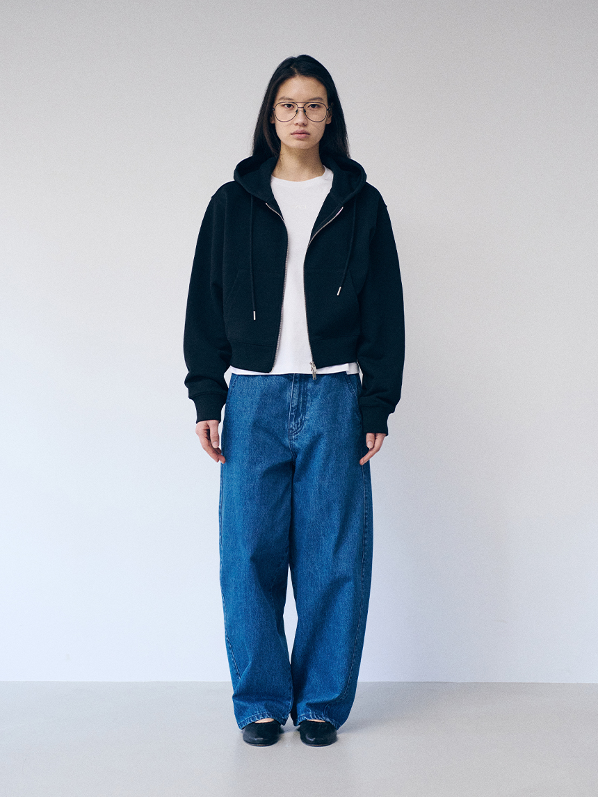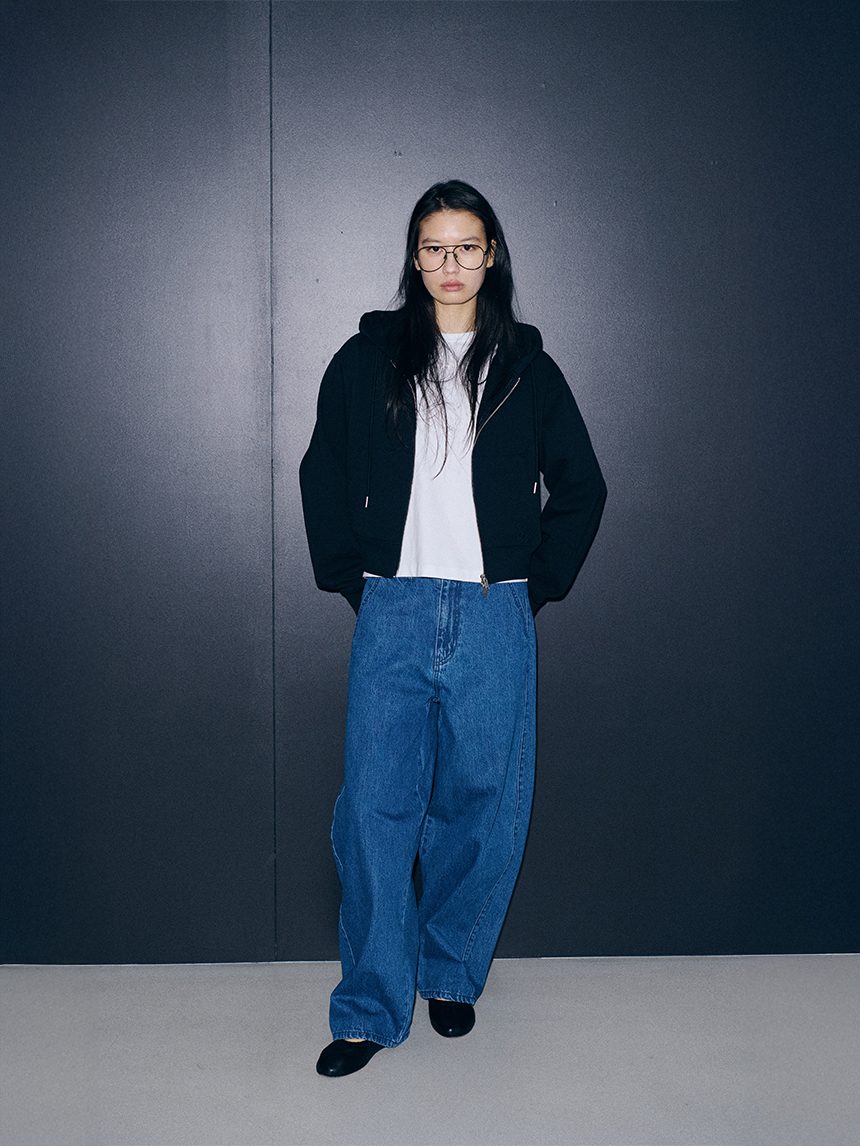 곡선의 실루엣이 매력적인 세미 루즈 핏 베럴 레그 데님 팬츠입니다.