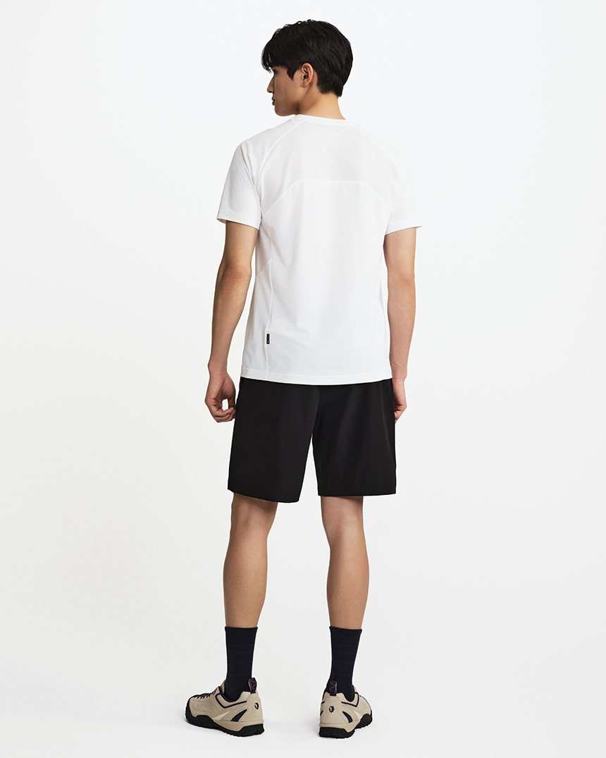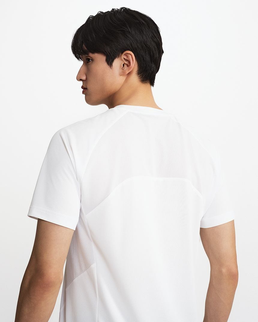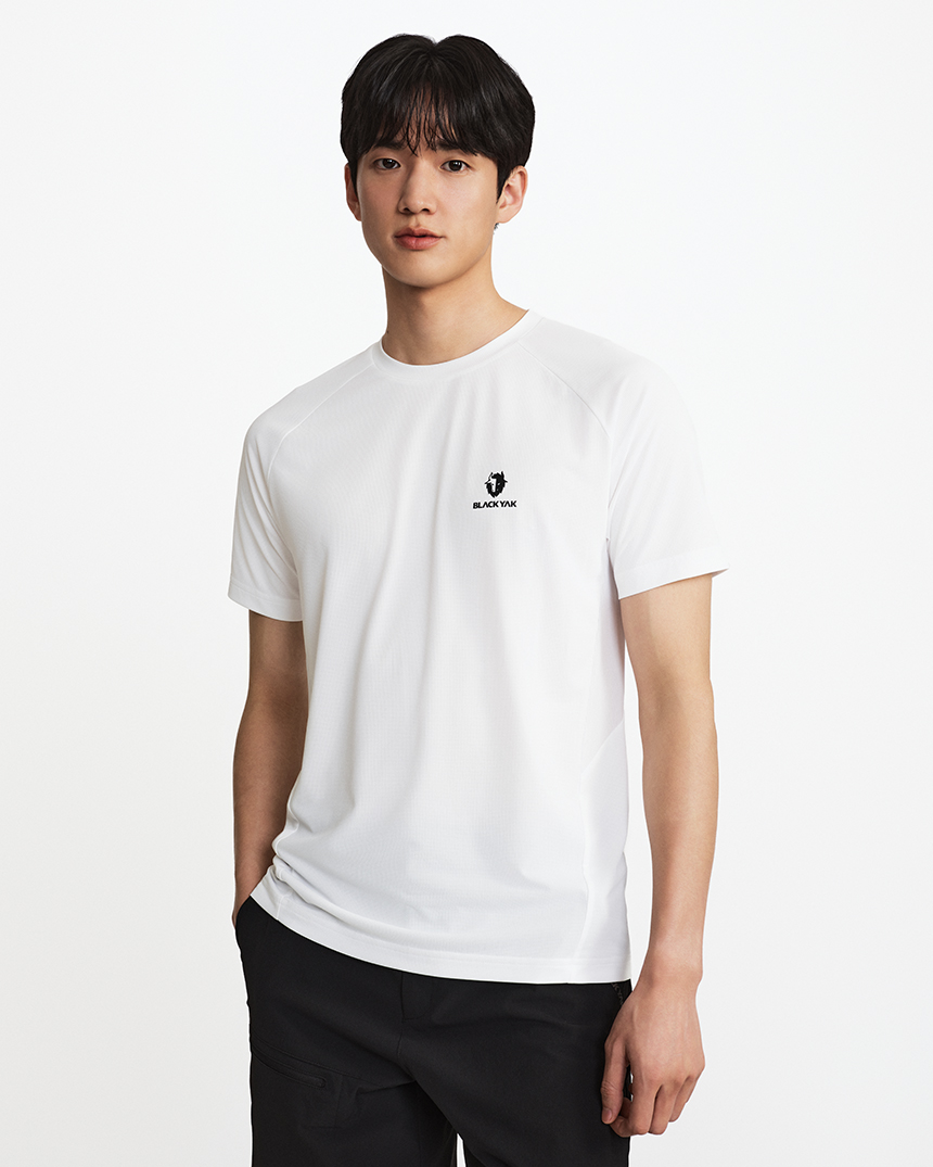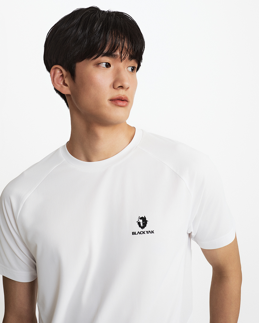 등판에 메쉬(Mesh)조직 원단을 적용하여, 각종 활동시 우수한 통기성을 가진 절개형 반팔 라운드 티셔츠 입니다.