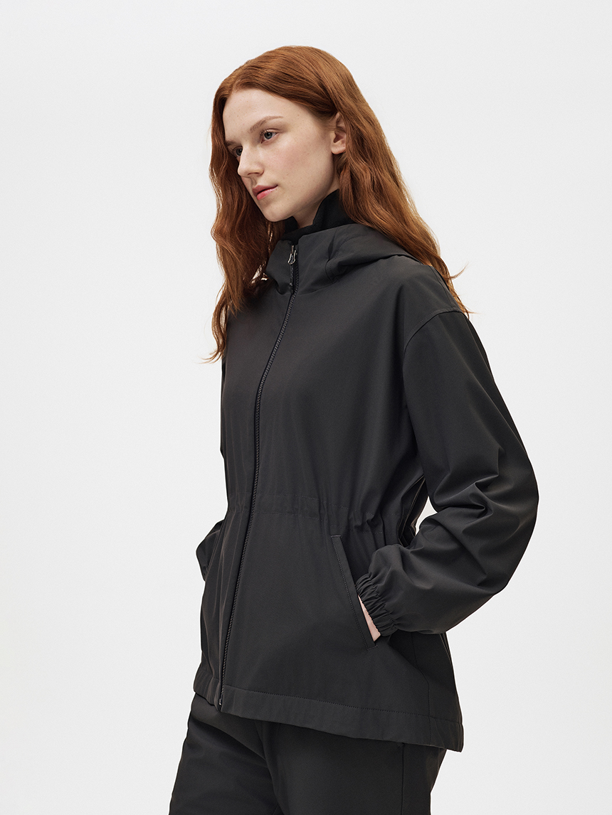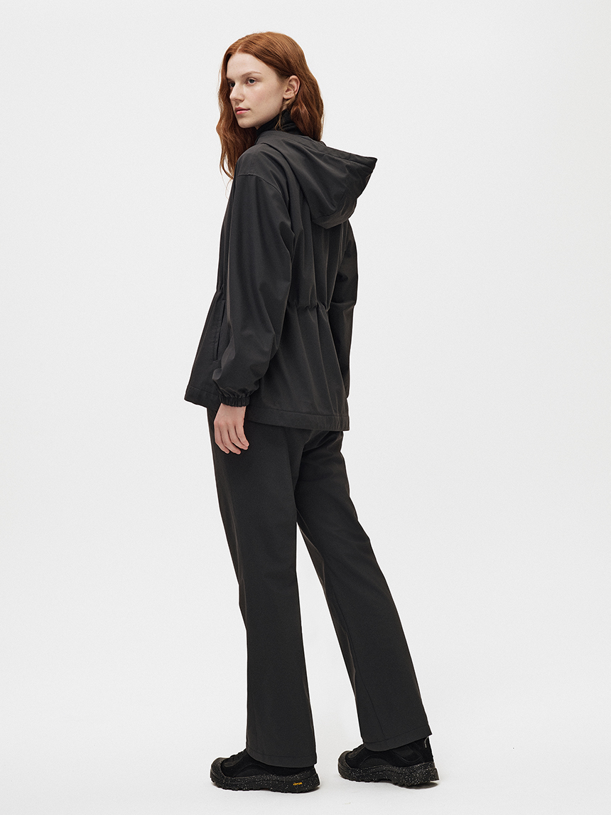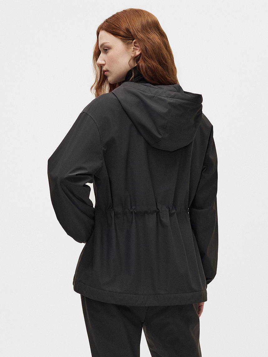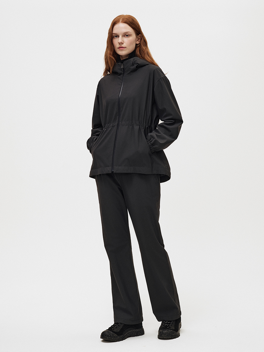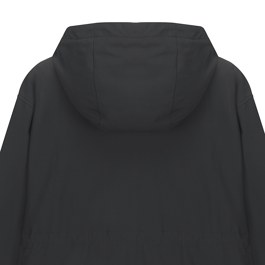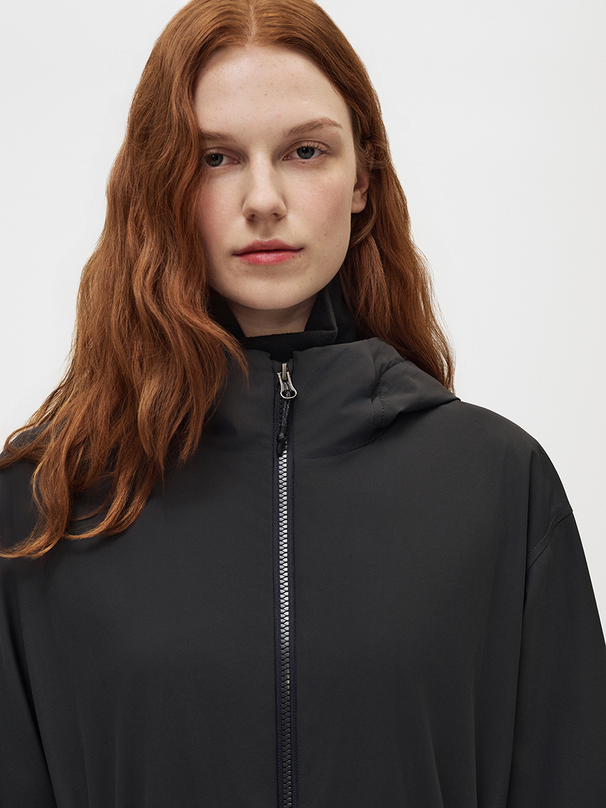 후드와 허리안 스트링 조임으로 자유로운 실루엣 변형이 가능합니다.