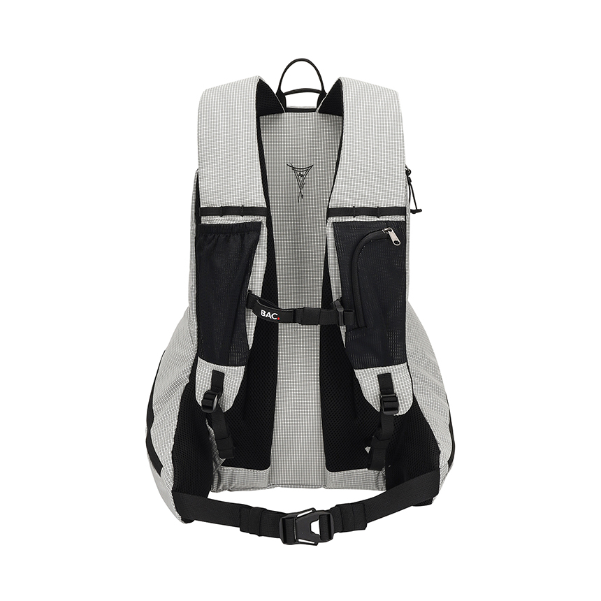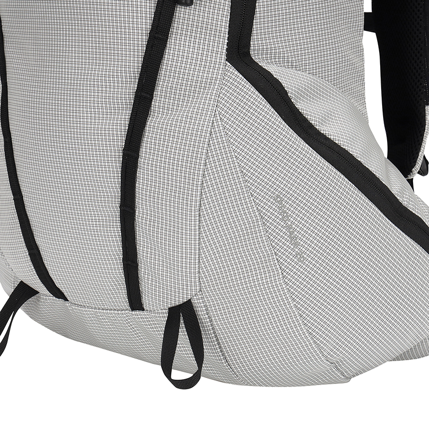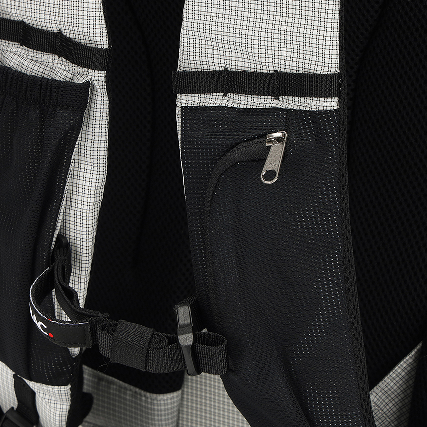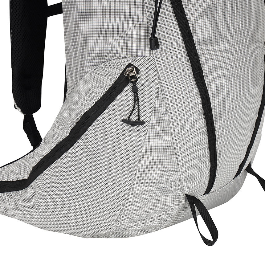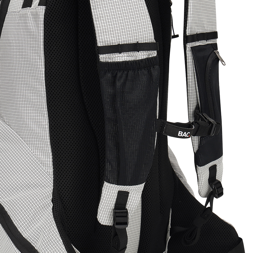 배낭 측면에는 소지품을 안전하게 보관할 수 있는 포켓이 마련되어 있으며, 배낭 전면과 연결된 지퍼로 구성된 실용적이고 편리한 디자인이 특징입니다.