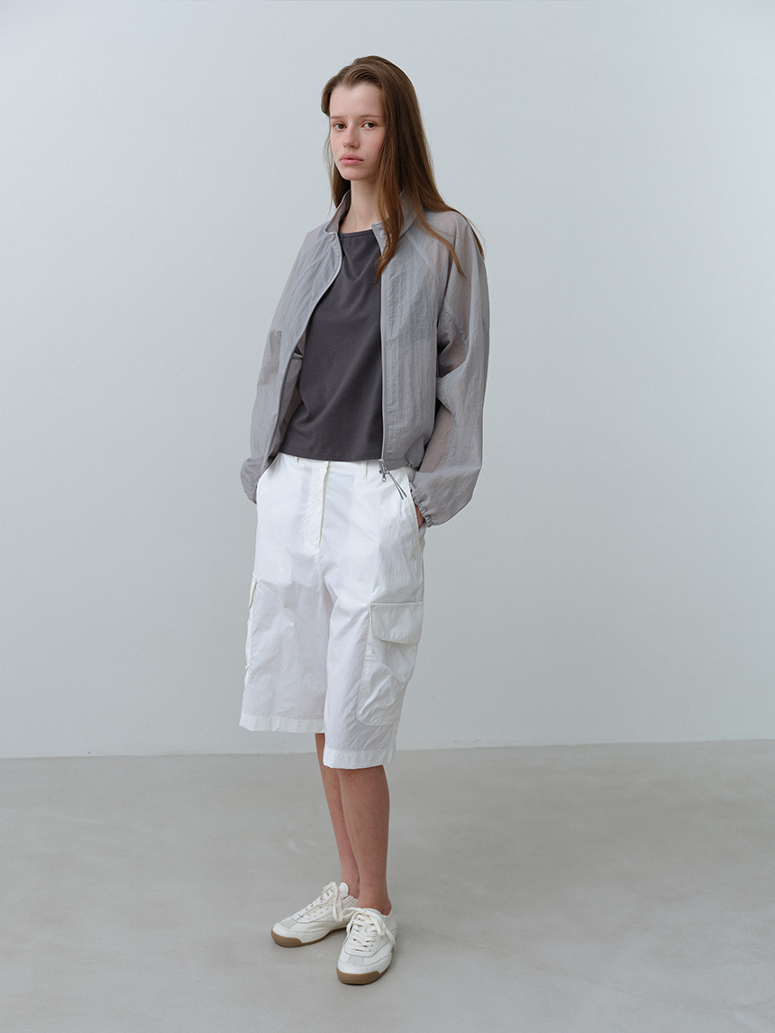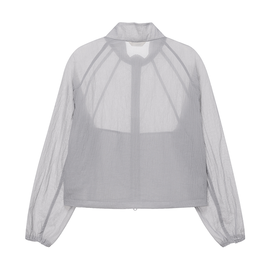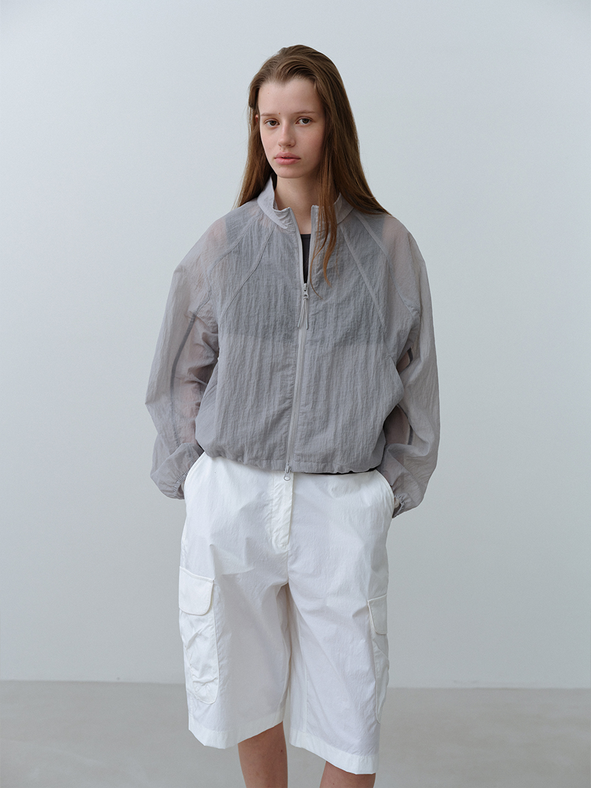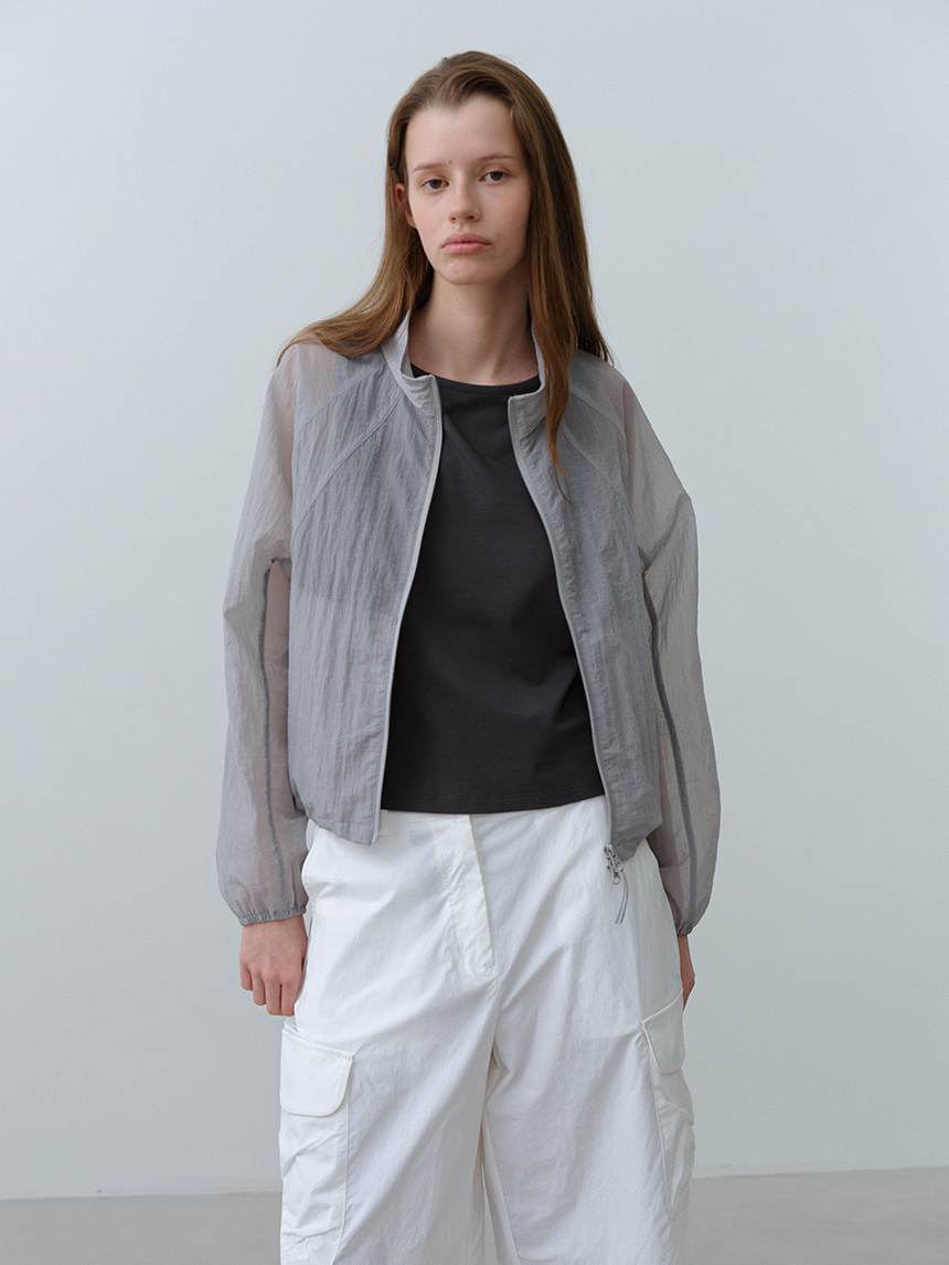 베일을 두른 듯 은은하게 비치는 시어 소재와 세미 루즈 핏이 어우러진 여성 하이넥 재킷입니다