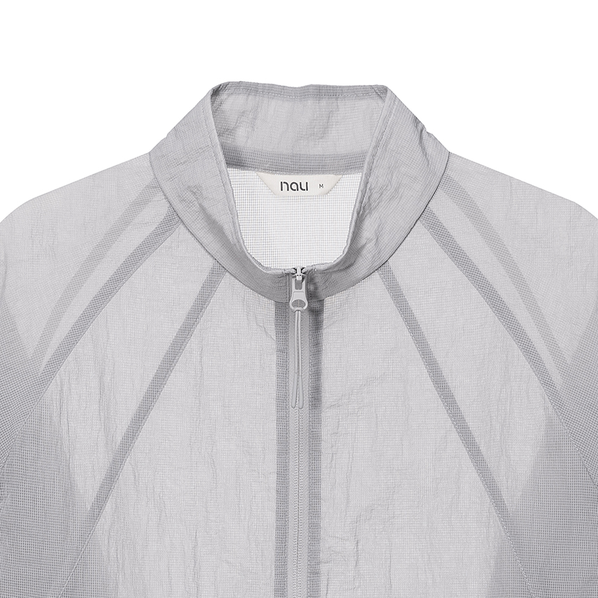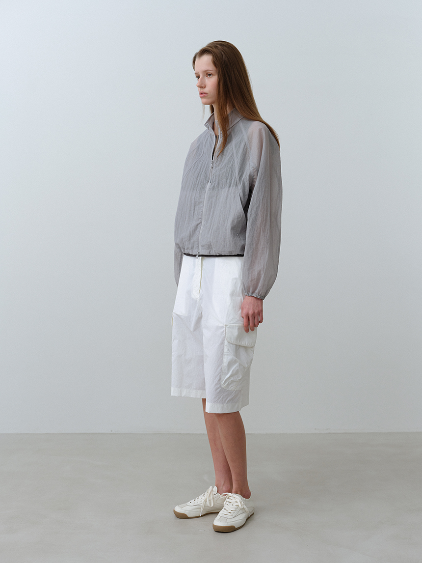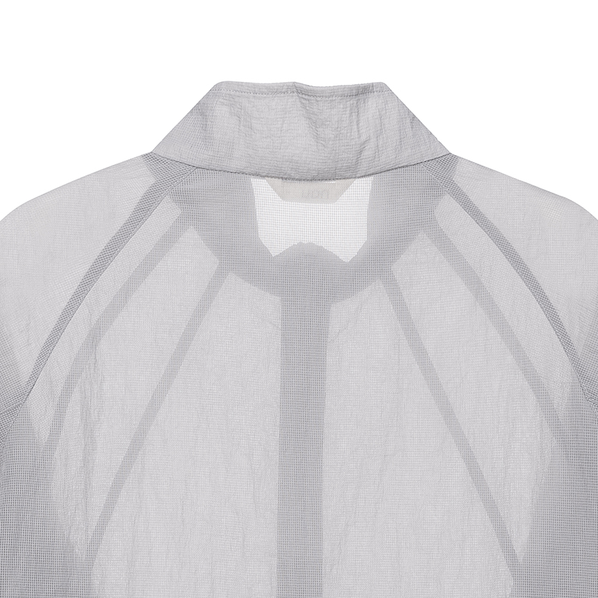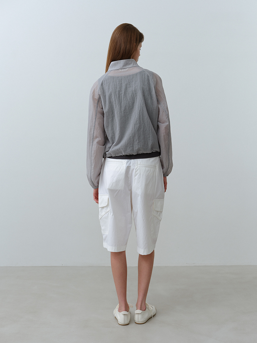 베일을 두른 듯 은은하게 비치는 시어 소재와 세미 루즈 핏이 어우러진 여성 하이넥 재킷입니다