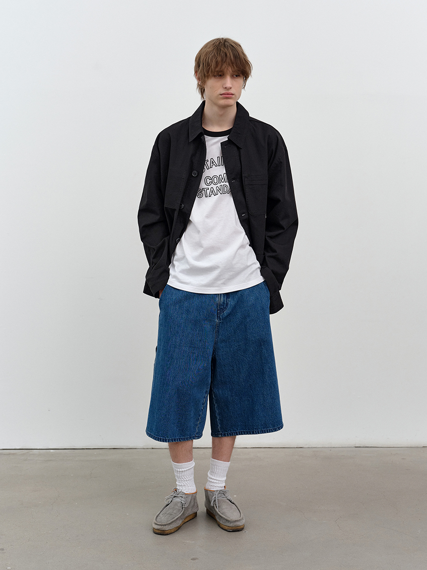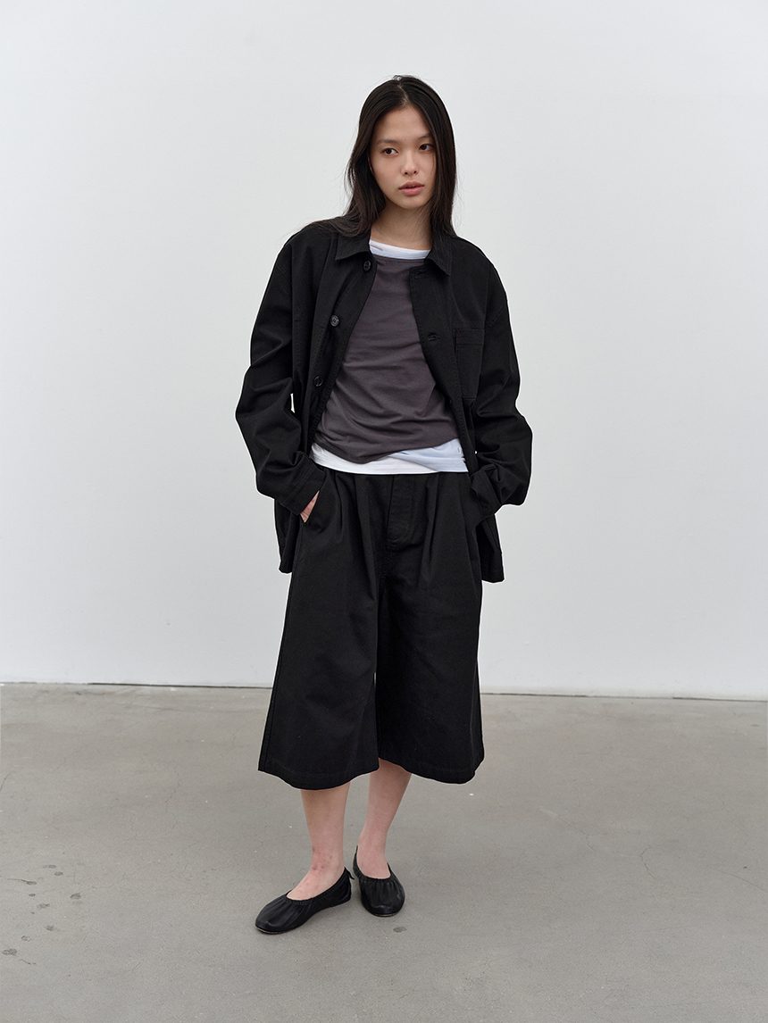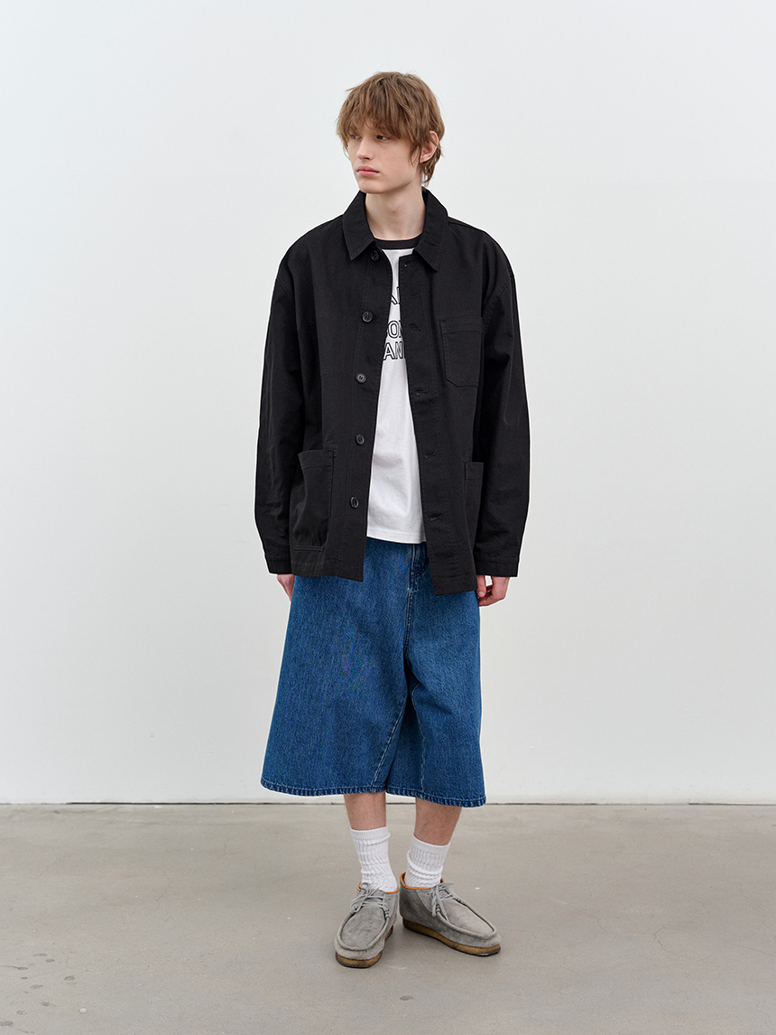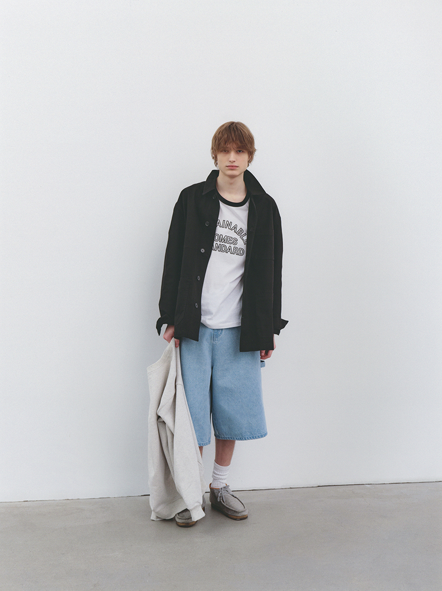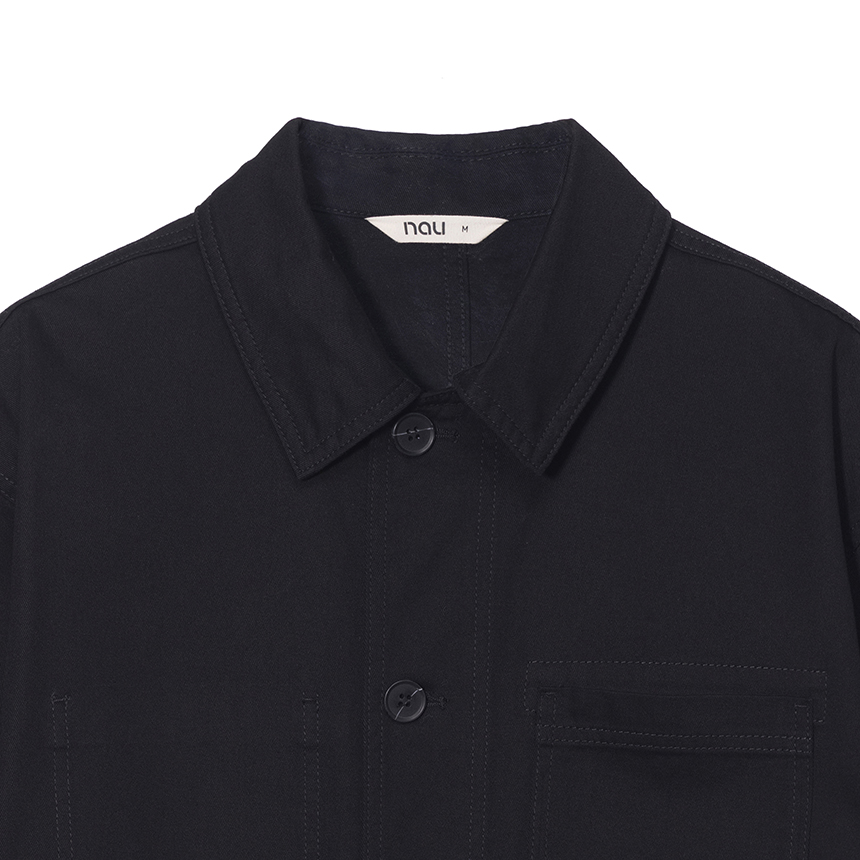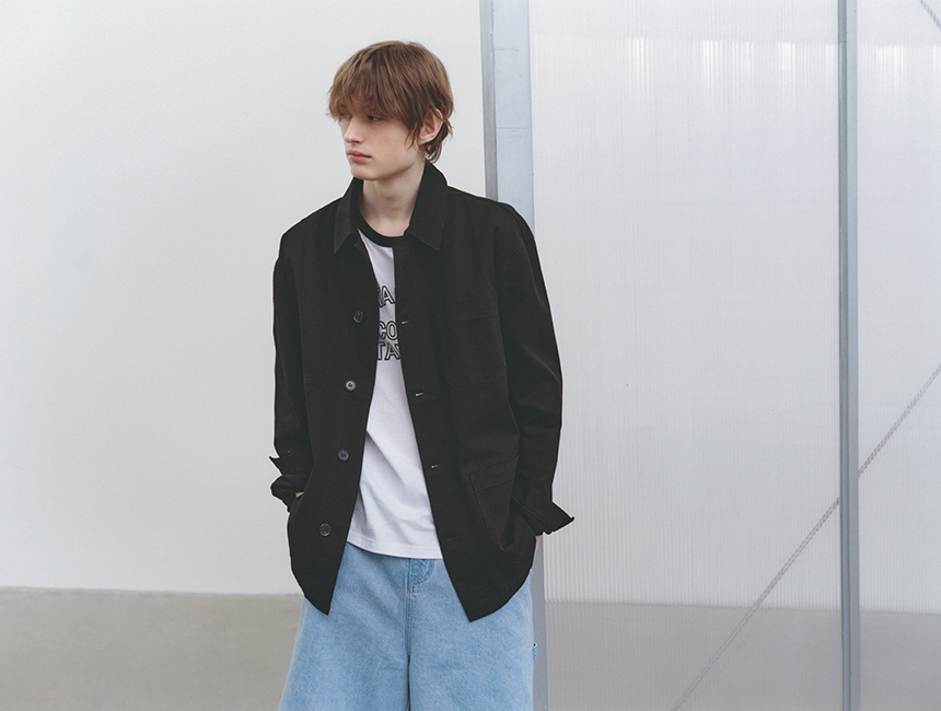 워크웨어 무드를 기반으로 한 전면 버튼 여밈 디테일로 클래식한 분위기를 연출합니다.