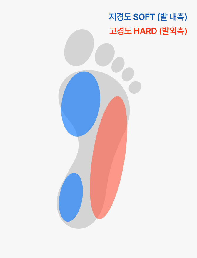발 안쪽의 부드러운 미드솔은 안쪽 무릎을 넓혀주고 발 바깥쪽의 단단한 미드솔은 바깥 무릎을 받쳐주어 체중의 부하를 최소화합니다.