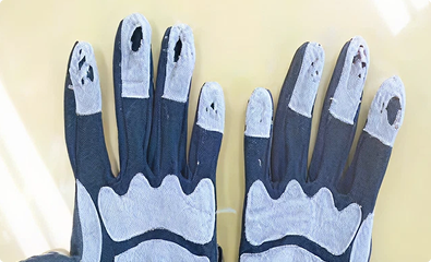 수선 전 | 실밥 풀림 및 마찰표면 손가락 원단부위 벗겨짐